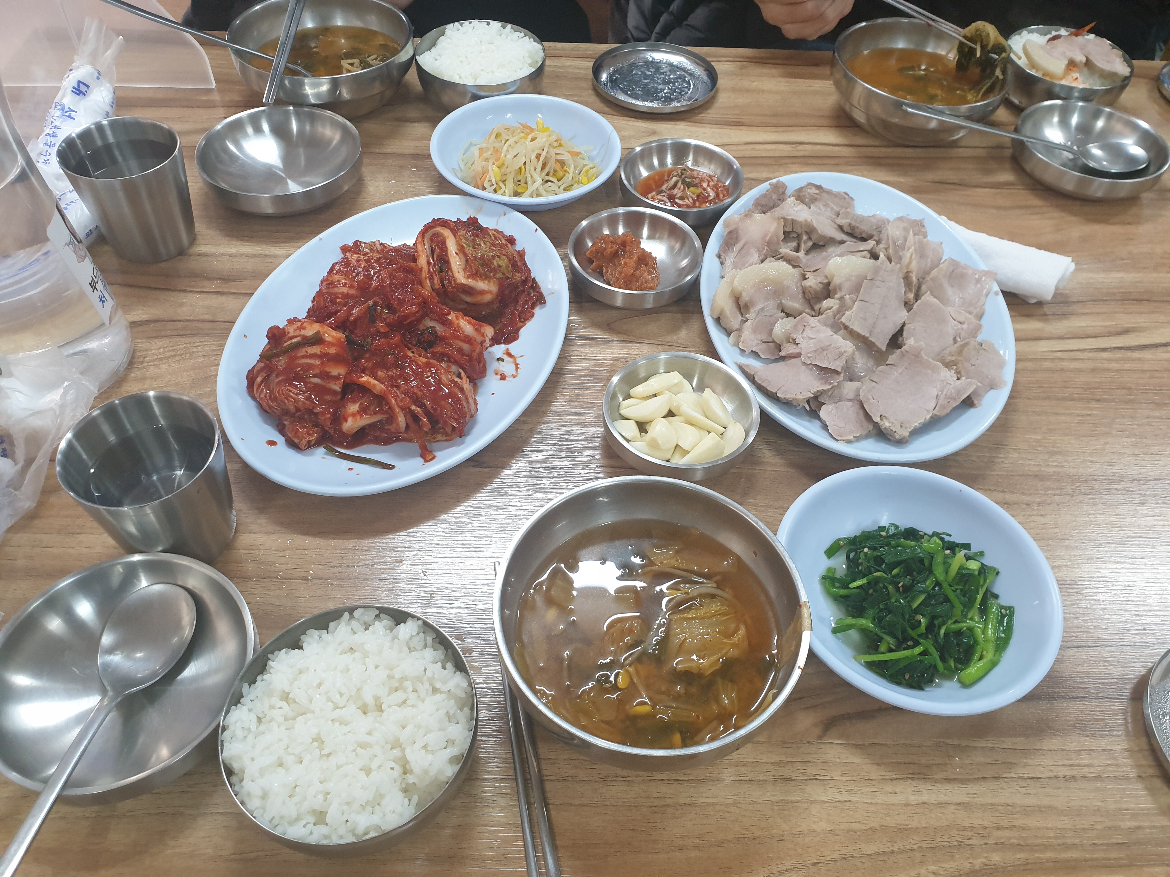 돼지고기는 양념이 강하지 않은데도 잡내가 거의 없더라고요. 김치는 보쌈김치 답게 매콤달달했고 갓담근 느낌이어서 돼지고기와 잘 어울렸습니다. 돼지고기를 김치, 마늘, 새우젓, 쌈장과 함께 먹으니 정말 맛있었습니다.